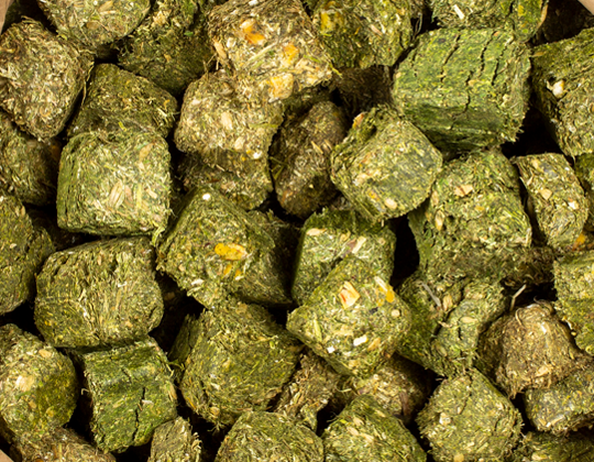 Mid-sized forage cubes (cm 3×3) made of forage chaff (Phleum pratense, Lolium italicum, Lolium perenne, Poa pratensis, Dactylis glomerata, Bromus inermis, Bromus catharticus, Festuca rubra; Medicago sativa), grain concentrates (Hordeum vulgare, Zea mais, Avena sativa) and sunflower oil (Heliantus annuus).