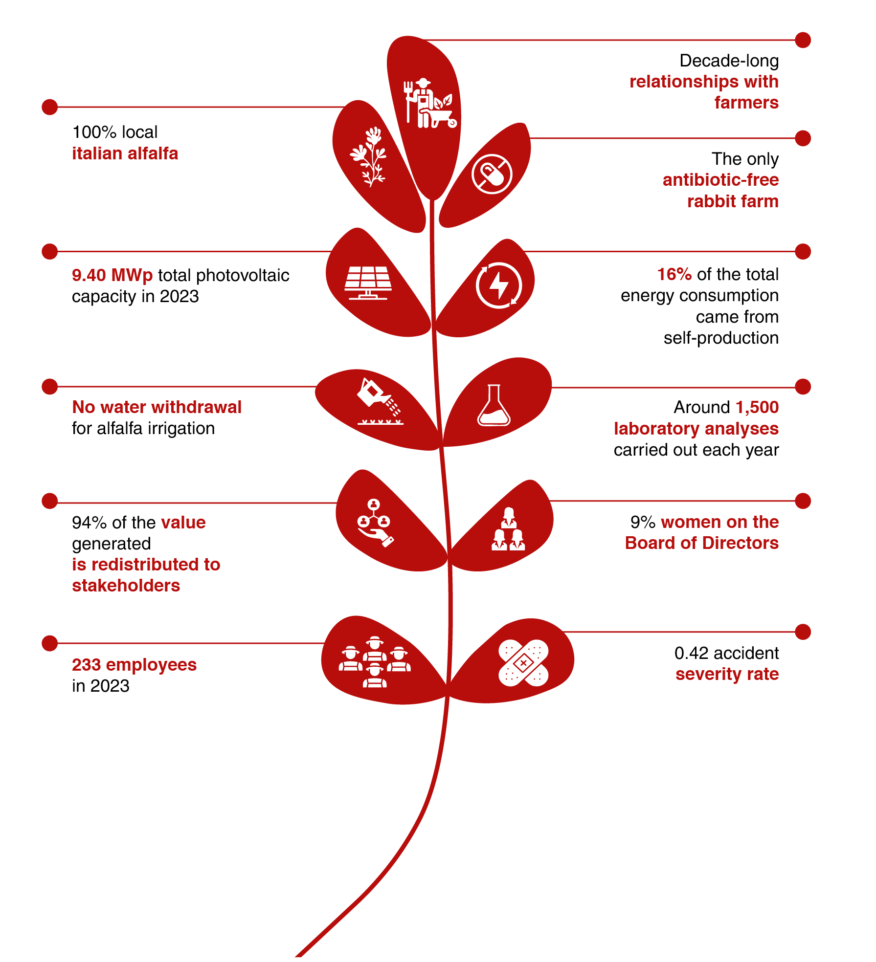 CARLIグループでは約230人の従業員が働いており、さらに数千人の農家やローカル企業の従業員が当社のサプライチェーンに関わっています。当社の工場は、その事業内容から、都市部から遠く、常に過疎化や失業問題に頭を抱える農村部に立地しています。サン・レオ工場のあるロマーニャ地方の後背地の丘陵地帯やポンツァーノ・ロマーノ工場のあるテヴェレ渓谷の田園地帯では、畑仕事、飼料加工や技術サポート、原材料の調達、輸送などに関する業務は地元住民が担っており、雇用基盤の維持と過疎化の食い止めに尽力しています。