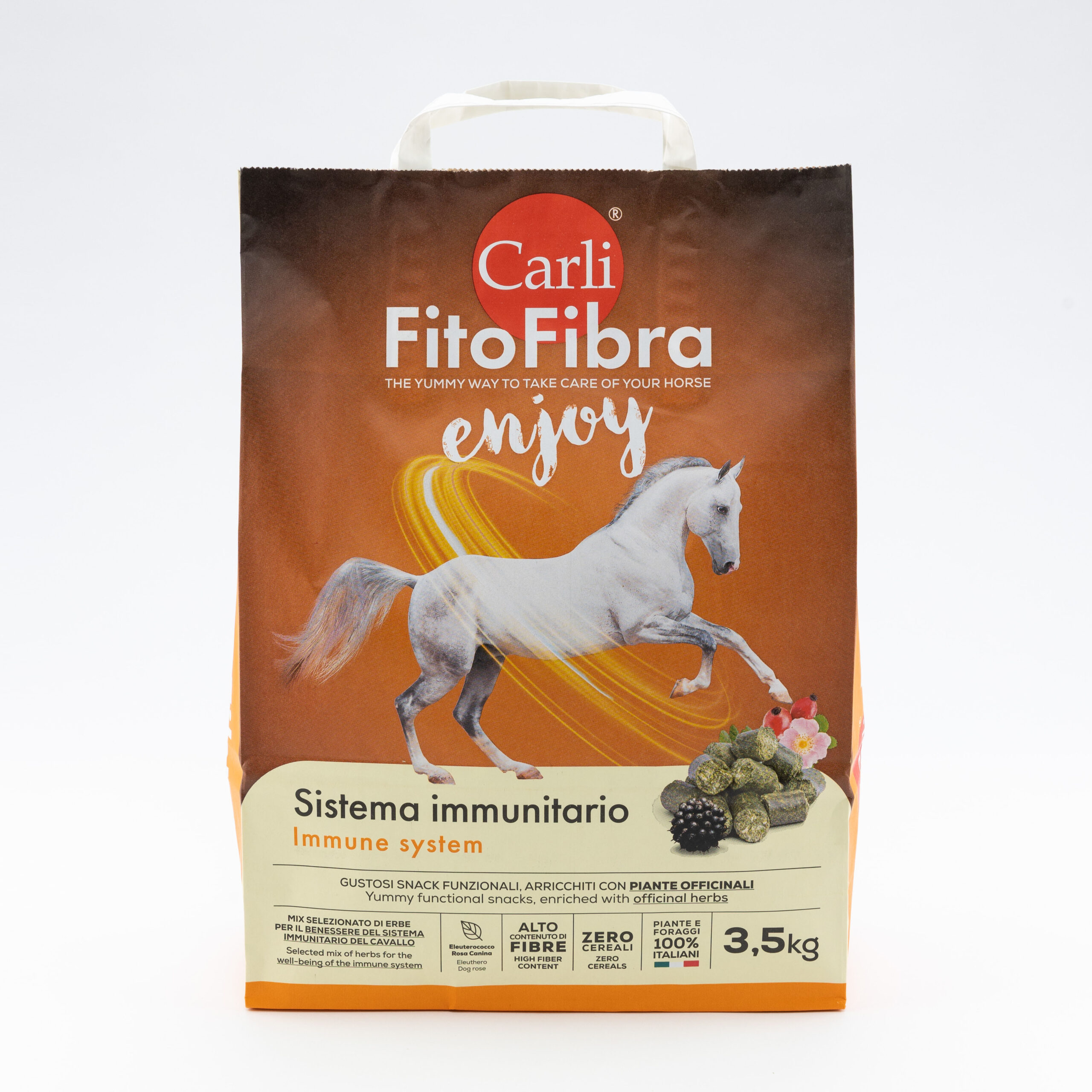 Carli FitoFibra Enjoy Sistema Immunitario è un mangime complementare sotto forma di pellettone, altamente appetibile, composto da una miscela bilanciata di erba medica e foraggi di nostra roduzione, con aggiunta di piante officinali tra cui eleuterococco, rosa canina e ortica.